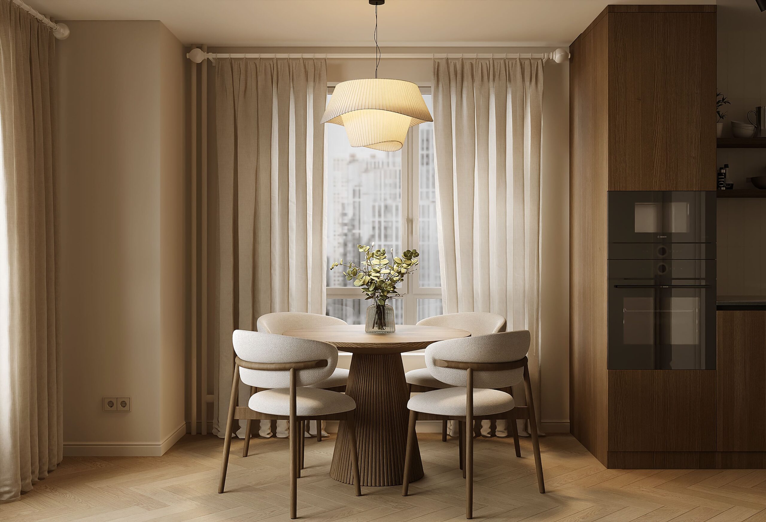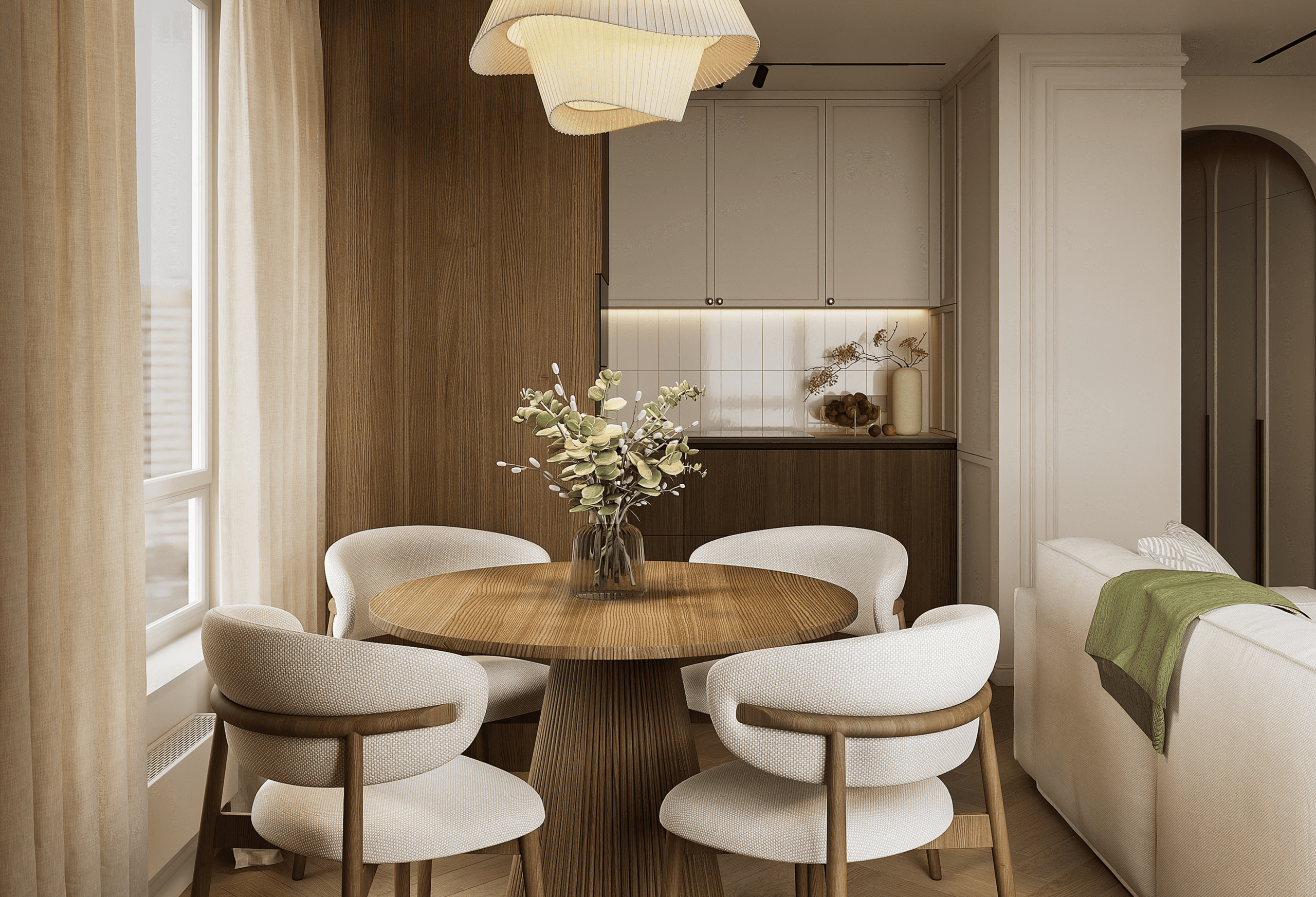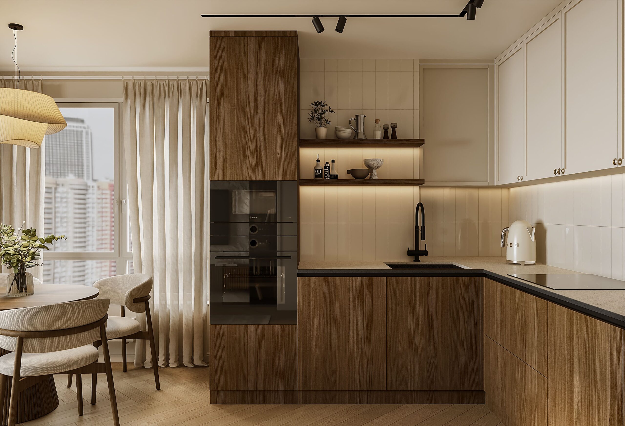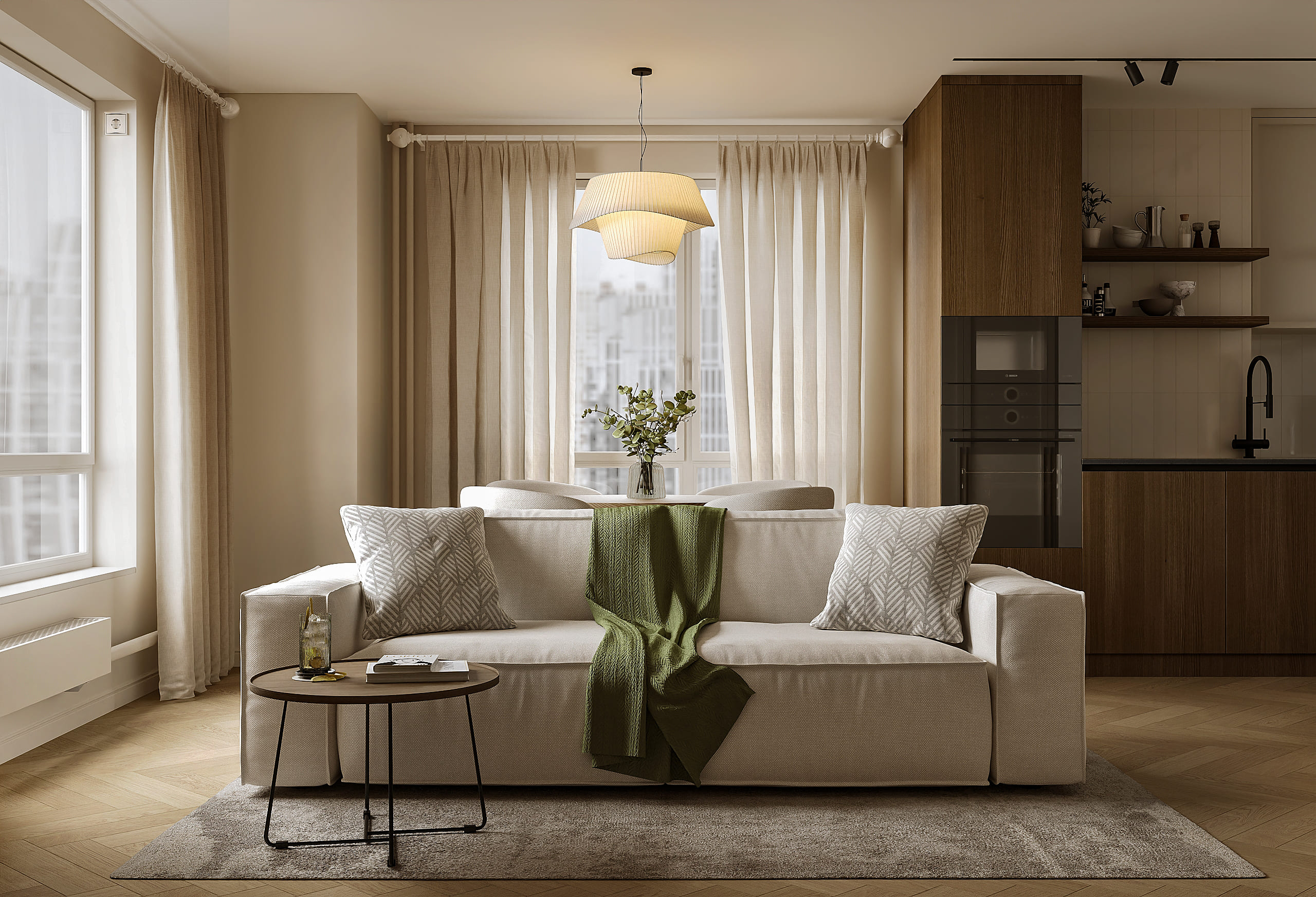 Кухня, напротив, чуть ярче, но спрятана в угол, чтобы не мешать общему восприятию. В результате интерьер получился светлым, практичным, уютным с максимальным акцентом на виде из окон.
