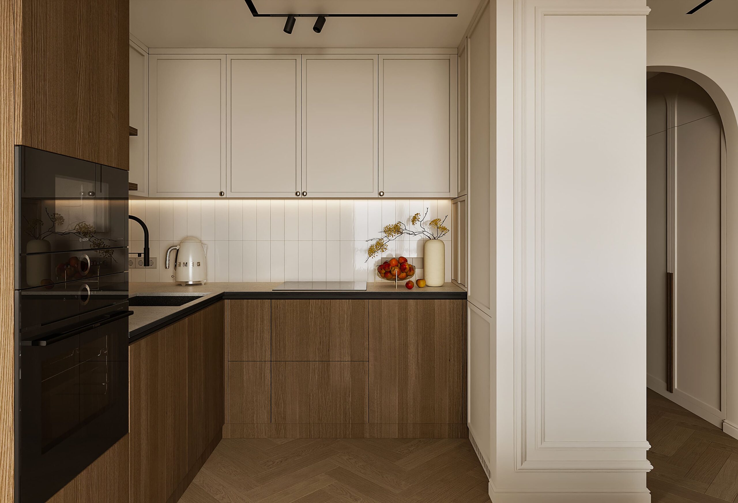 Для этого мы в качестве декора выбрали молдинги, которые добавляют классический акцент. Освещение – интересные светильники с нотками винтажа.