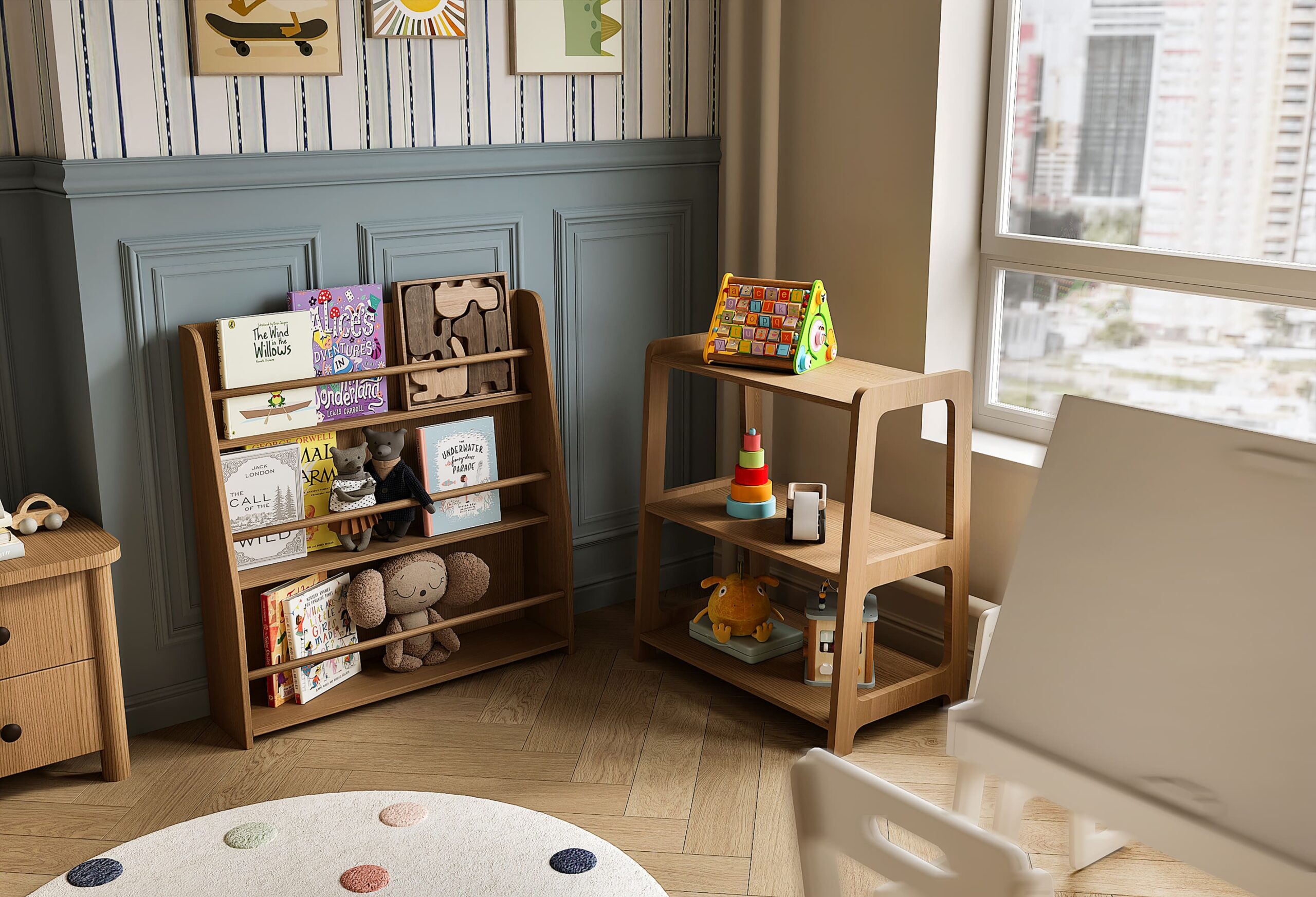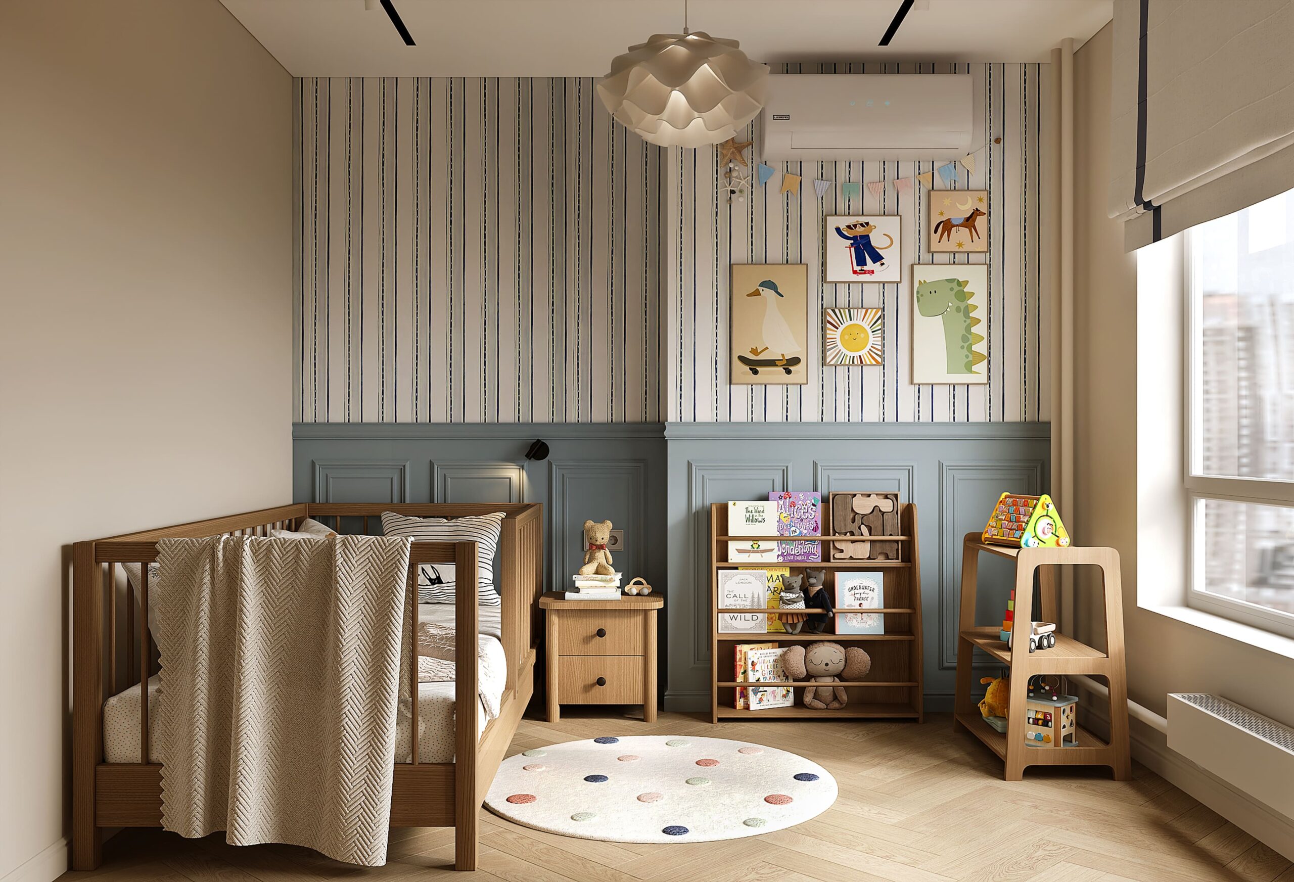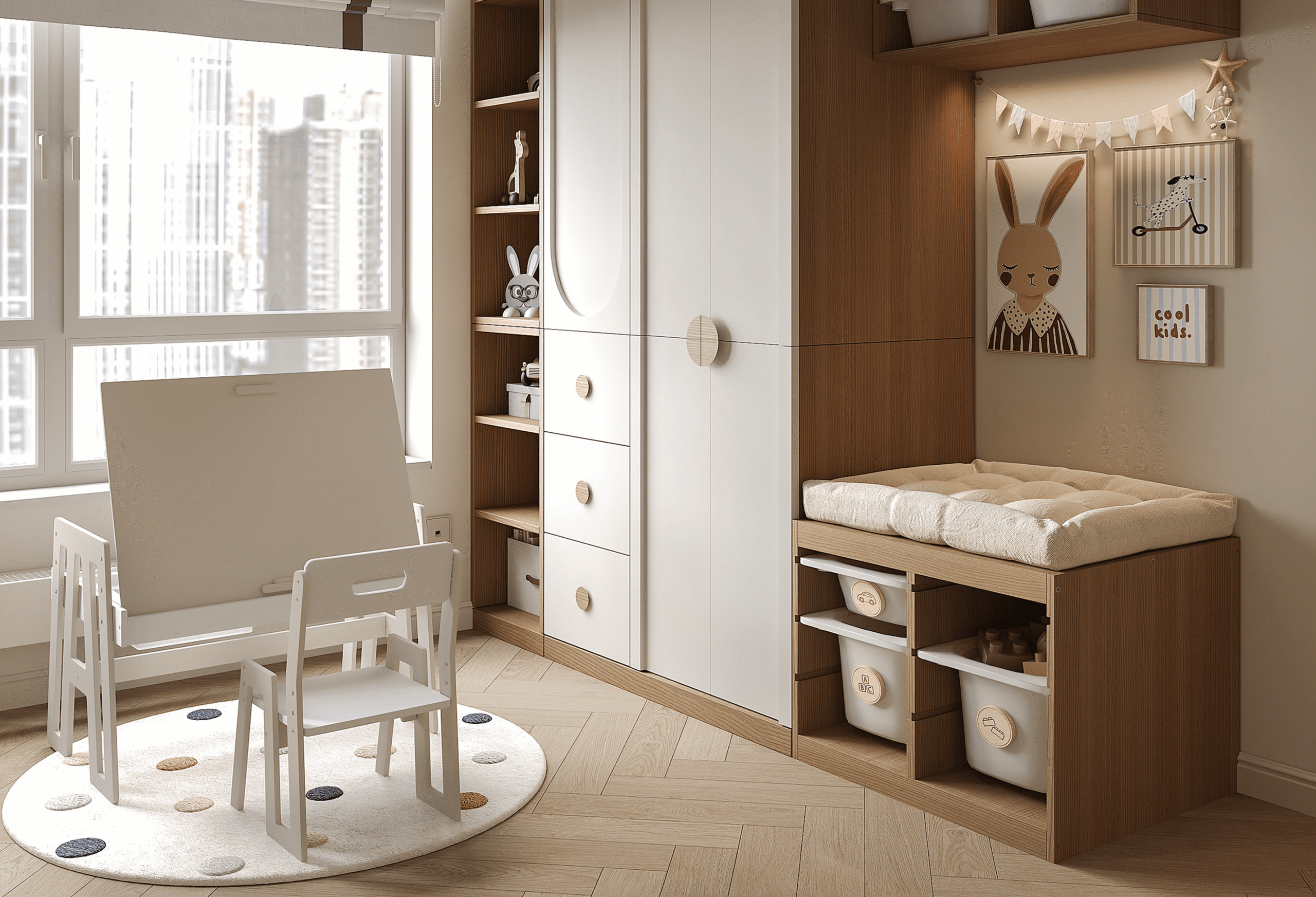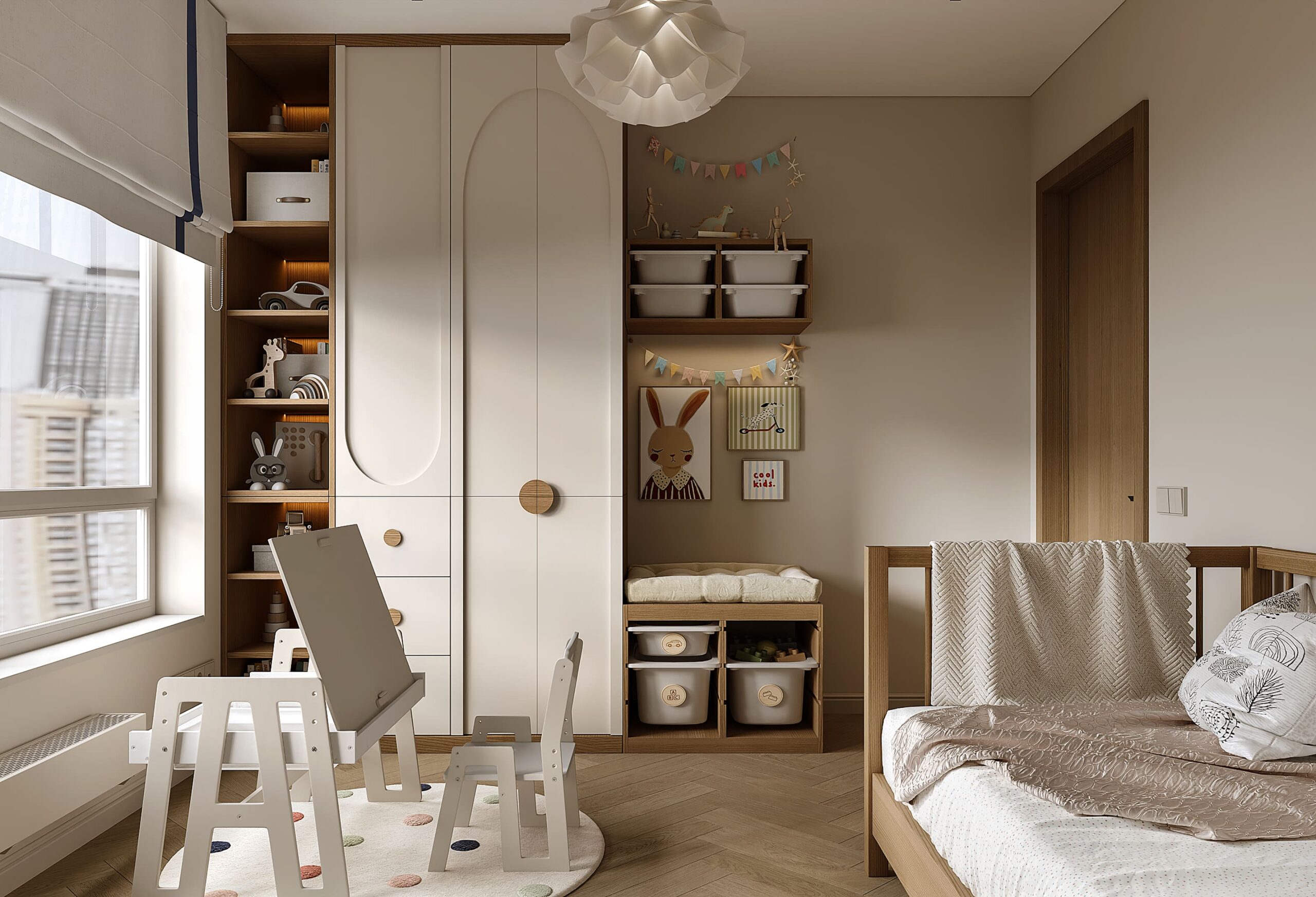 Дизайнеры предусмотрели для ребенка функциональный столик, который будет и местом хранения, и рабочей зоной, и мольбертом. Для рисунком маленького Пикассо отведен участок стены с наилучшей освещенностью.