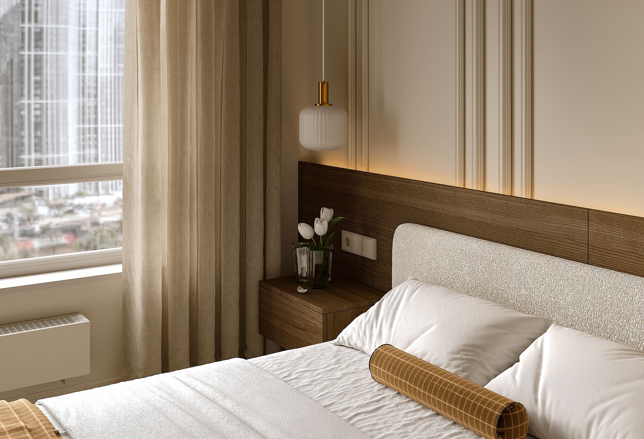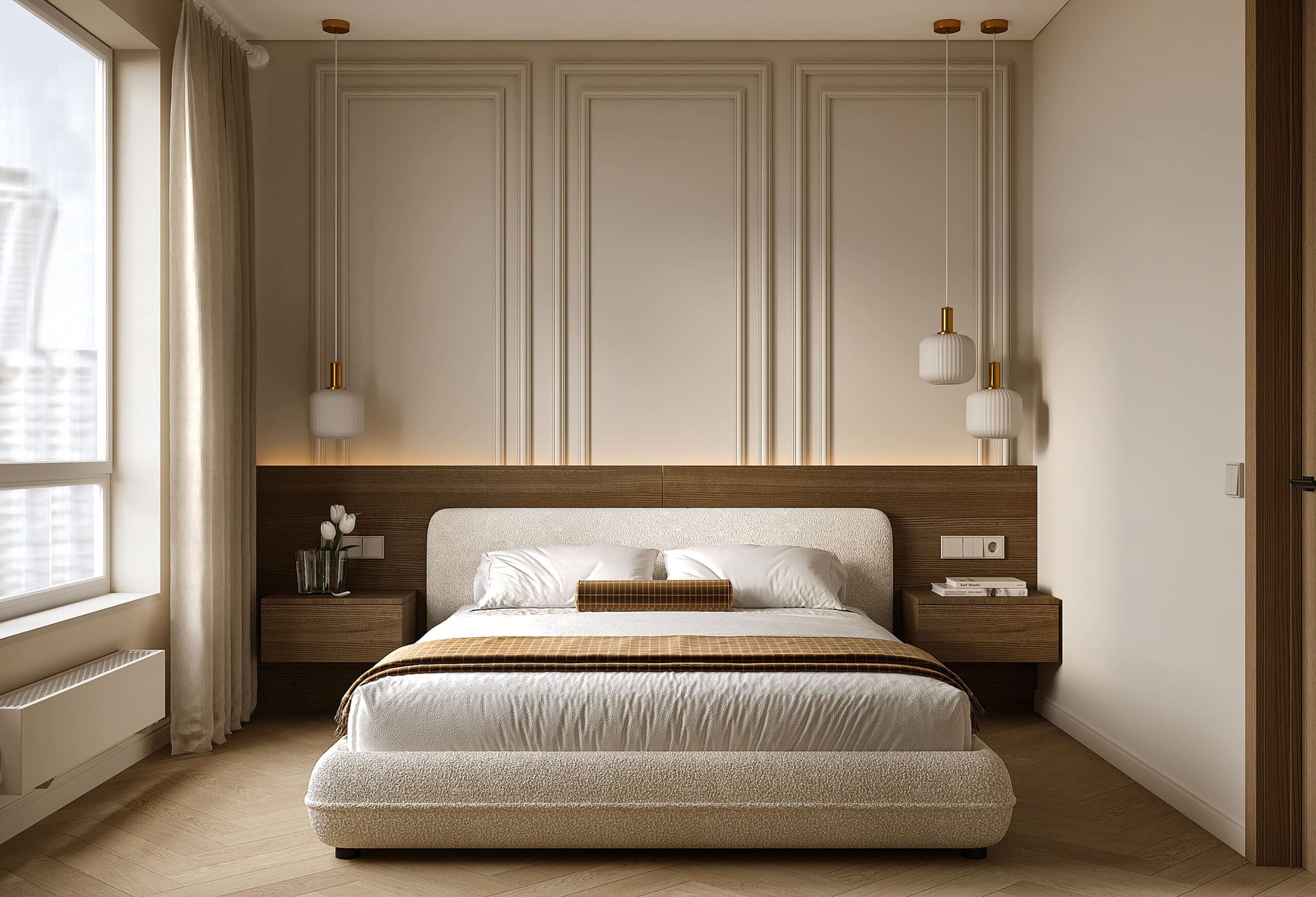 Деревянное изголовье привносит естественность, лёгкость и современность, а обои под штукатурку отсылают к стилю лофт.
