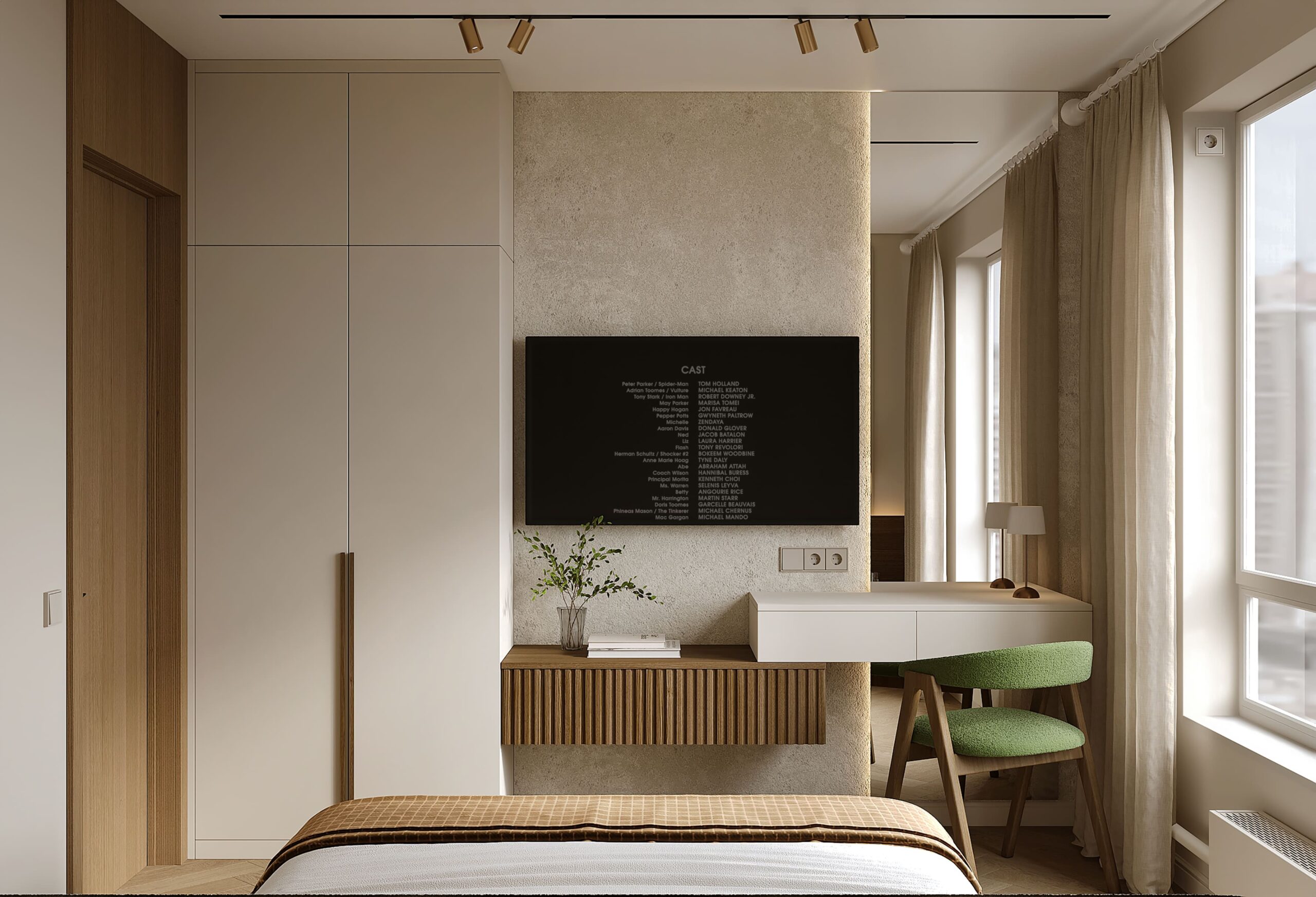 Заказчик хотел, чтобы спальня не выглядела вычурно и ярко, но при этом сохраняла винтажные детали и оставалась практичной.