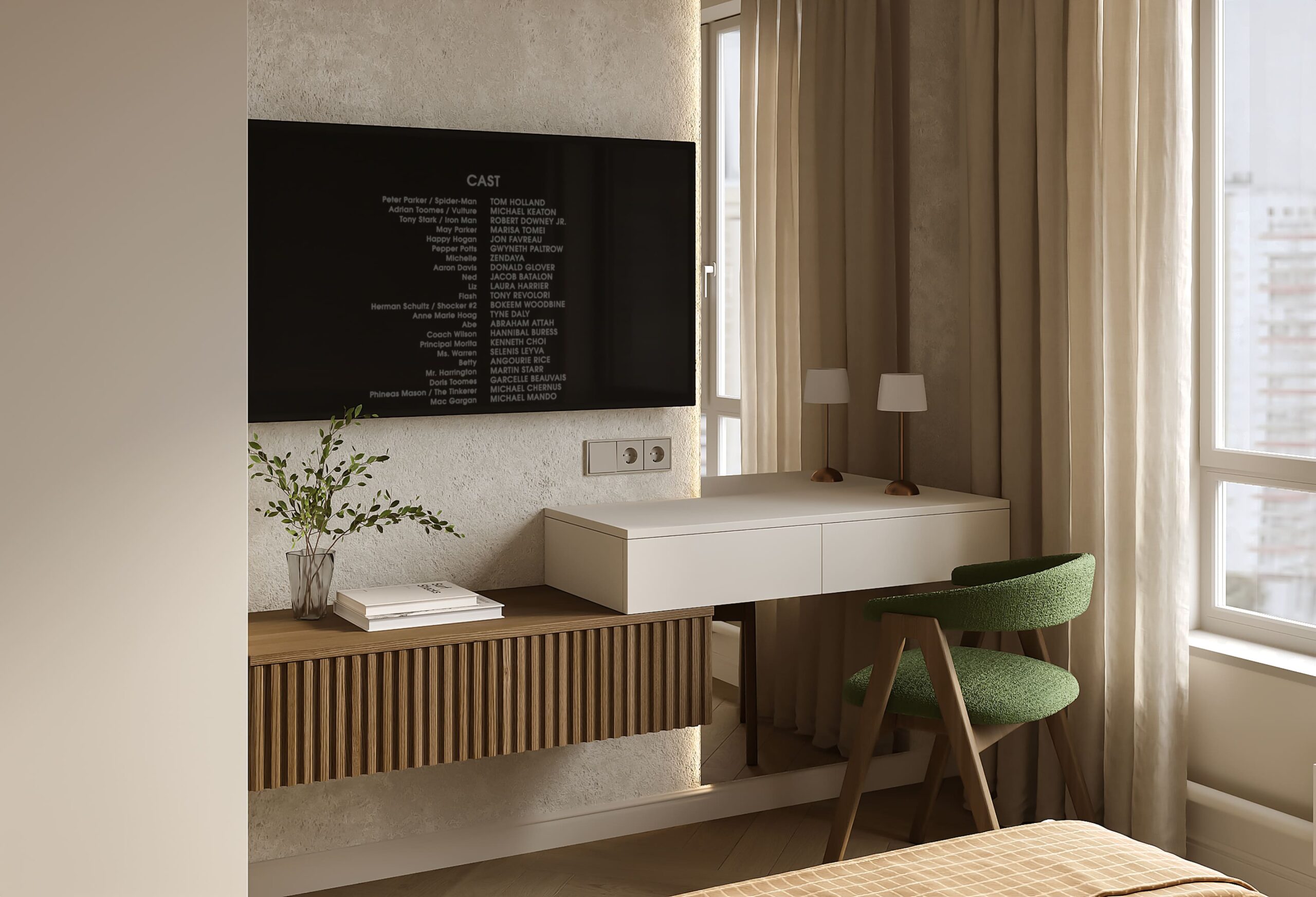 Как и в спальне, в этой комнате смешалось сразу несколько стилевых направлений. Деревянная поверхность мебели отсылает к скандинавскому стилю, а молдинги — к классике.