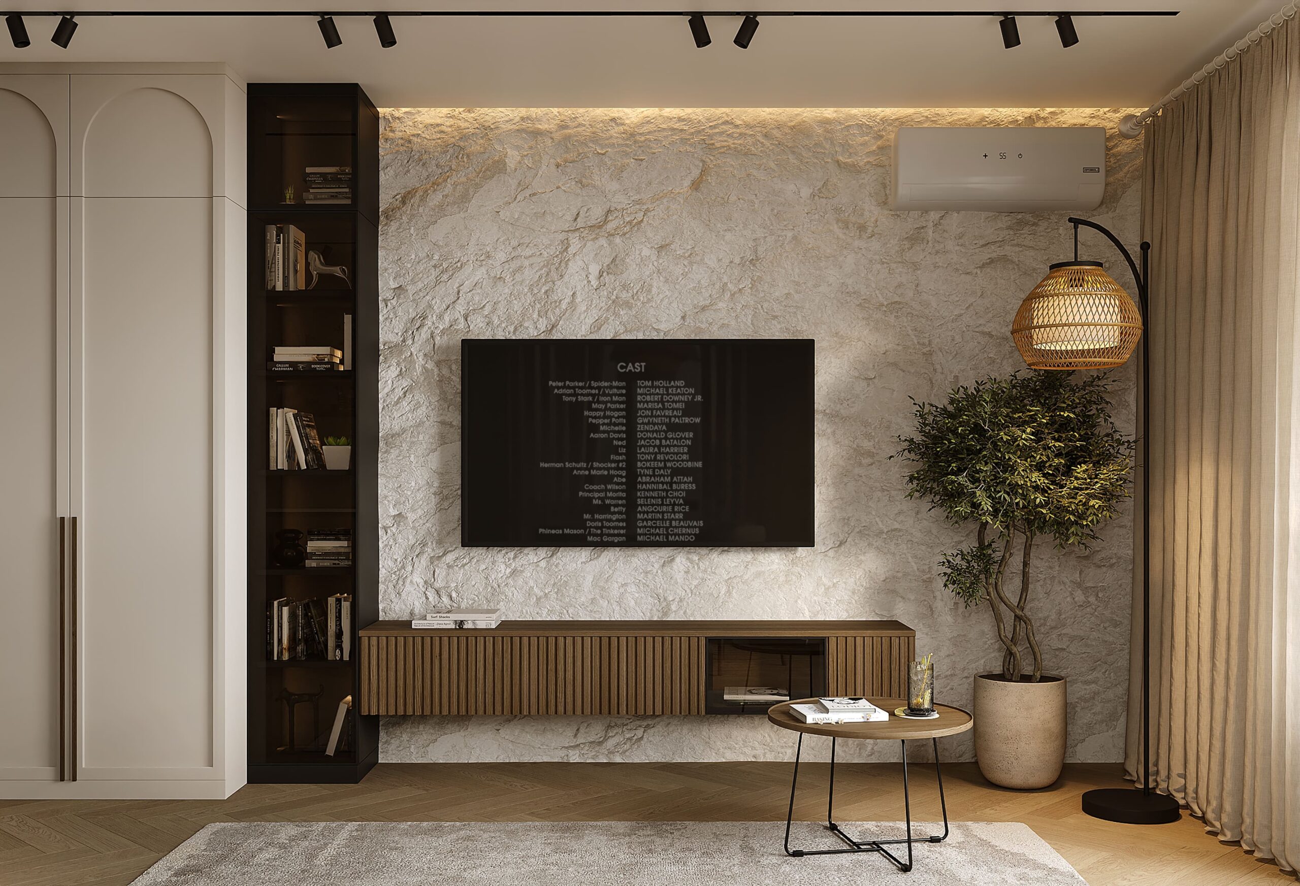Контраст между светлой мебелью и «брутальными» бетонными обоями, создает интересный визуальный диалог.