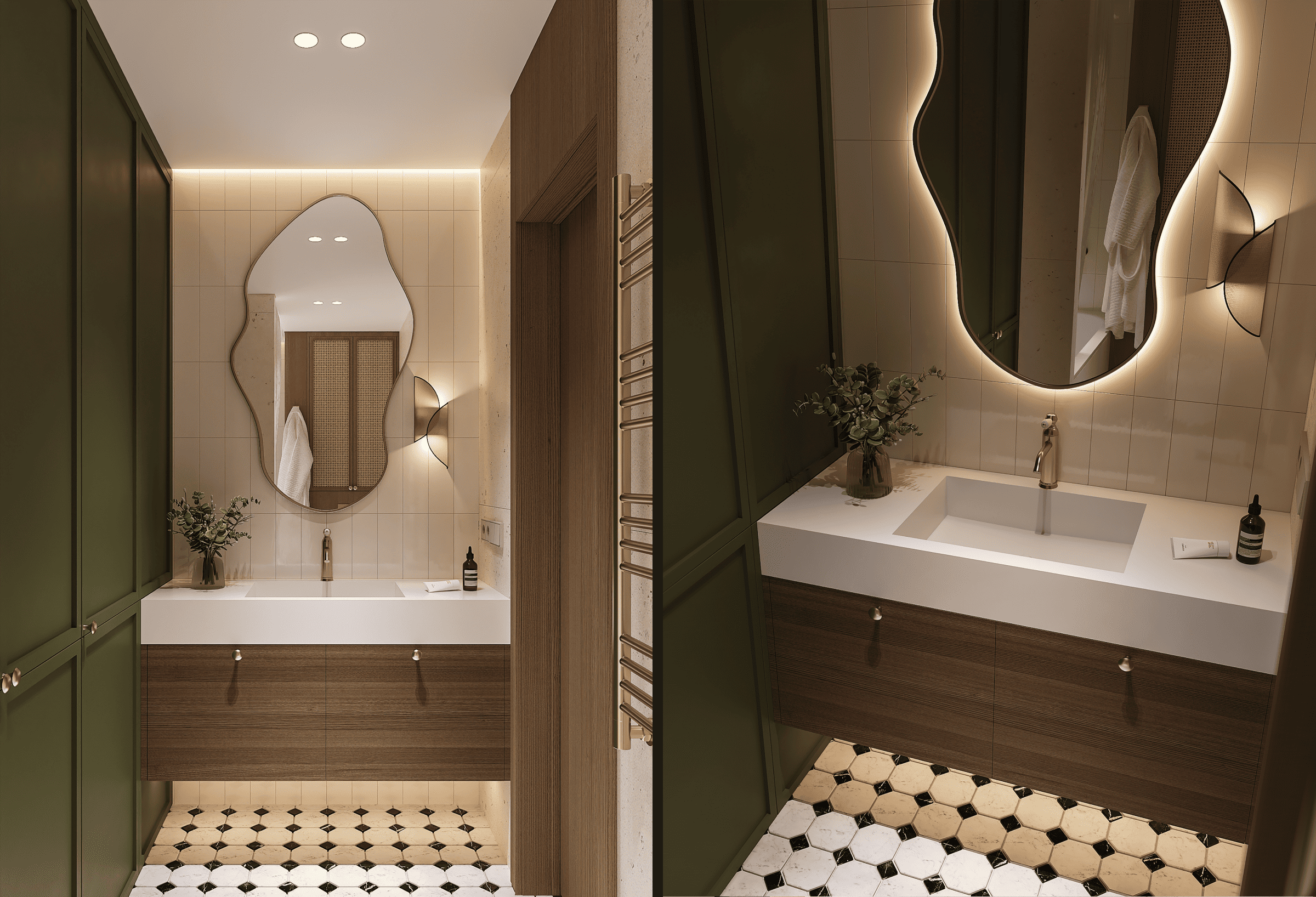 В ванной комнате мы решили дать волю смелости и использовать насыщенные оттенки и выбрали выбрали стилевые направления контемпорари и ар-деко.