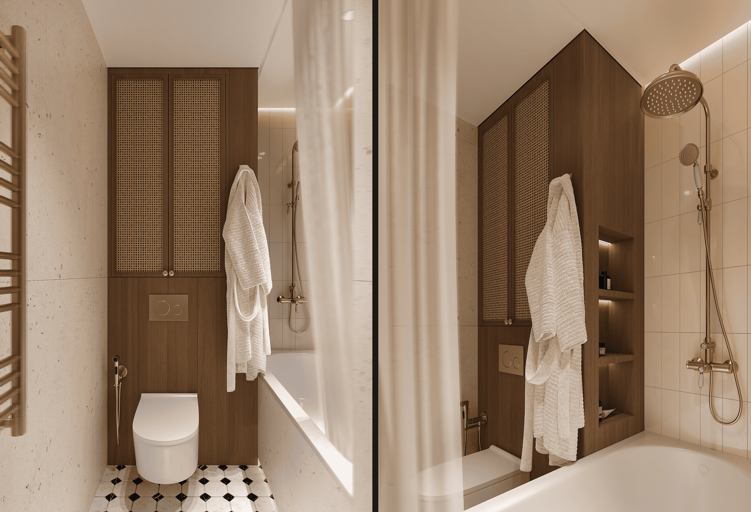 Дополняют интерьер бионическое зеркало и латунная сантехника в итальянском ретро-стиле, которая гармонично завершает общий образ комнаты.